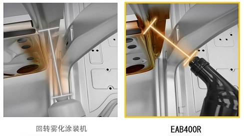 带角度的喷枪枪头扩大了机器人的可动范围同时也提高了针对狭小部分的直面接近性,实现了出色的进入度和高涂着效率。